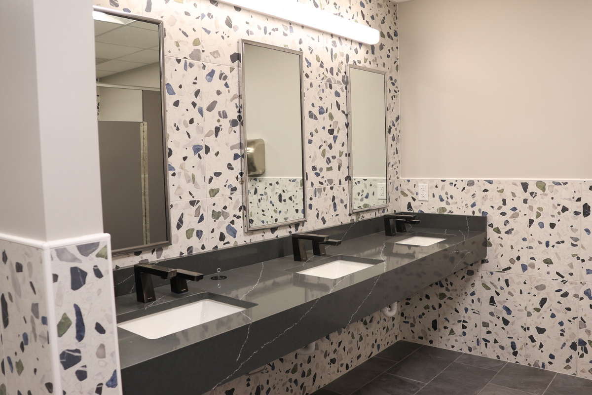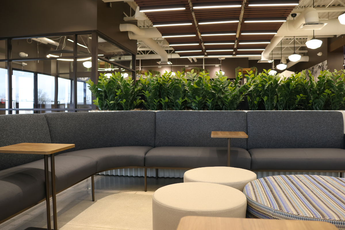 Locker Rooms & Fitness Center: Bright and welcoming locker rooms now connect to a fitness center featuring a turf strip, hydration station, and vibrant color palette to energize employees.